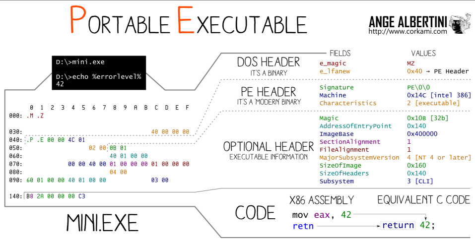 Portable Executableとは主に32ビット/64ビット版Microsoft Windowsで使用される実行ファイルのファイルフォーマットのこと。ファイルフォーマットという名前からも分かる通りあるきまった形式に沿って作られています。