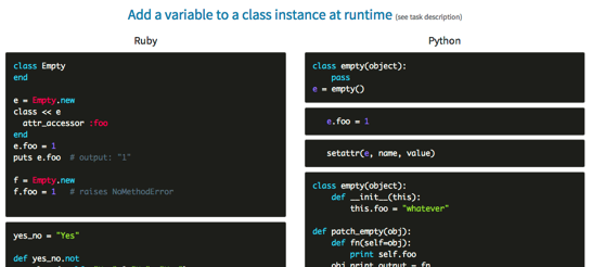 文字通り、サイドバイサイドで2つの言語の特徴を比較できるサイトで、例えば「Ruby」と「Python」を選択すると、この2つの言語のトピックスごとのコードサンプルがずらっと表示されます。