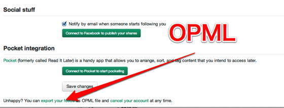 OPMLエクスポートは、画面右上のアカウント名をクリックし、「Settings」→画面下の「export your feeds」でダウンロードできます。
