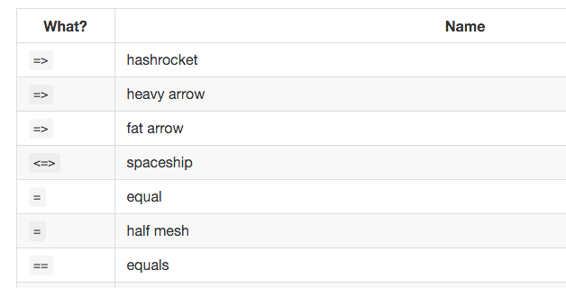 ▲例えばハッシュ記法で使用する「=>」は、hashrocket、 heavy arrow、fat arrowといった名前で呼ばれていることがわかります。特にhashrocketは検索してみると日本語で情報もみつかるので結構メジャーな呼び方のようです。