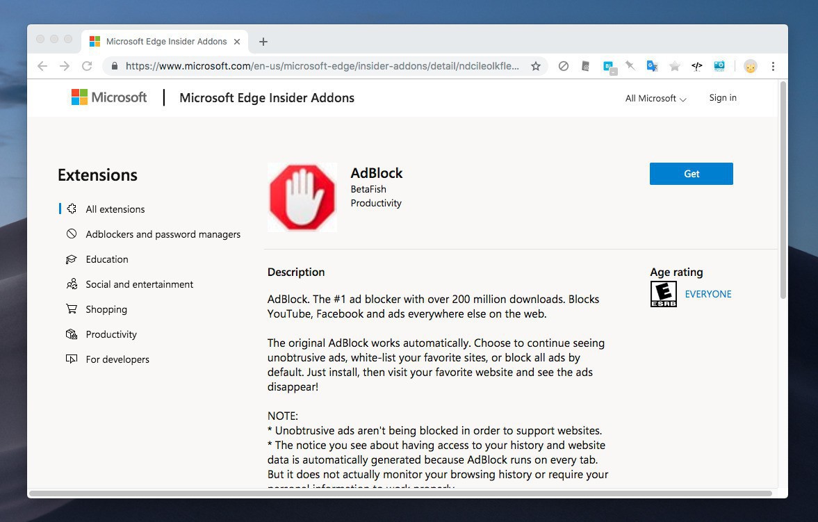 現在はまだ動作していませんが、それぞれの拡張ページには「Get」ボタンが存在し、新しいEdgeでサイトにアクセスしてクリックするだけで拡張機能がインストールできることが予想できます。