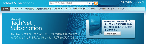 MicrosoftがTechNetサブスクリプションサービスの提供終了を発表しました(TechNet サブスクリプション サービス提供終了のお知らせ、slashdot)。