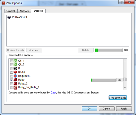 ZealではDashで利用できるdocsetが全て利用できます。どのようなdocsetが存在するか、Dashのwebサイトを参照すれば分かります。Dashを使えなくて残念に思っていたWindows / Linux 開発者の方は使ってみてください。